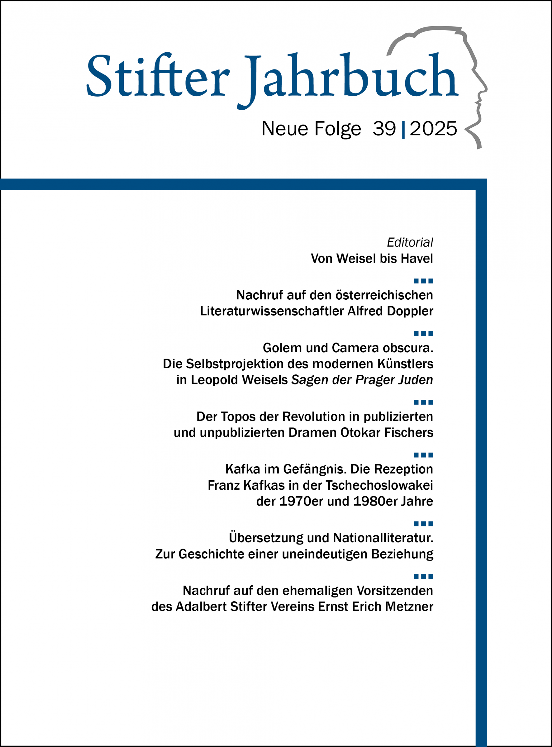 Außerdem enthält der Band wie immer den Jahresbericht des Kulturinstituts sowie des Kulturreferenten 2025, Rezensionen, die Zeitschriftenschau sowie Nachrufe auf den im Alter von 103 Jahren verstorbenen Doyen der Stifter-Forschung Alfred Doppler und unseren ehemaligen Vorsitzenden Ernst Erich Metzner.