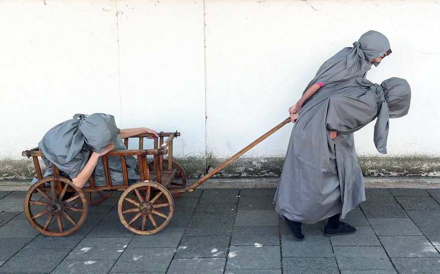 Drei in graue Decken Gehüllte ziehen schwer und erschöpft einen Leiterwagen. Man hört die Erlebnisse der Zeitzeuginnen parallel zur Tanzperformance. Sobald die Musik beginnt, reißen sich die drei die Decken vom Leib, enthüllen bunte Dämoninnenkostüme und tanzen ihre ganze Wut, aber auch ihren neuen Lebensmut gemeinsam mit dem Publikum heraus.